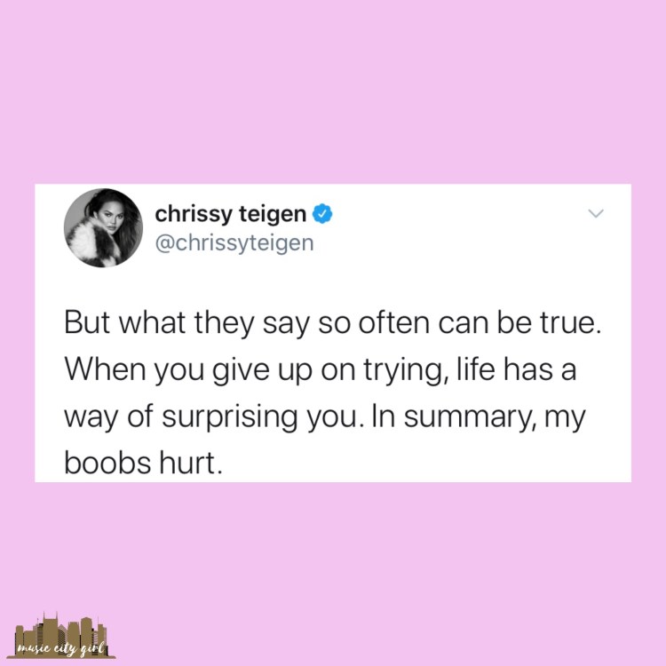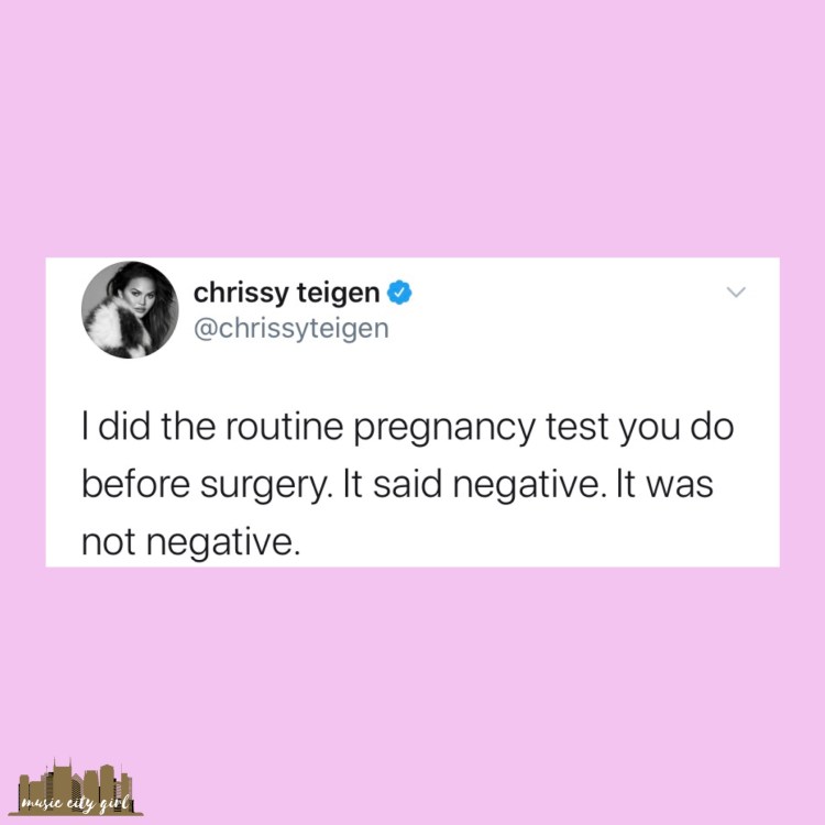 That evening I attempted to go to bed early, but due to back pain, I was a little restless and turned my phone back on. I got on Snapchat and went to Daily Mail to get my daily fix of what was going on in my favorite celebrities’ lives. As I passed through the articles, I saw the news that Chrissy Teigen and John Legend announced they were having another baby. I was super excited for them, but then I remembered that Teigen had a breast implant removal surgery in June. I wondered if she was pregnant when she had the surgery. After doing research online, I couldn’t figure out the timeline of her pregnancy and my curious/confused/concerned self decided to take my question to Twitter.