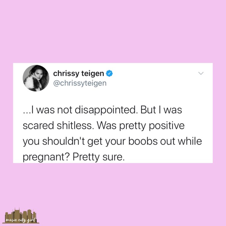 I tweeted, ”Question… @chrissyteigen just announced she’s pregnant. Before my breast reduction last year, they did a pregnancy test. Was she pregnant when she had her surgery in June? I feel like with her bump she had to be pregnant before that, but I could be wrong. I’m confused.” When I tweeted this, I didn’t think she’d reply.